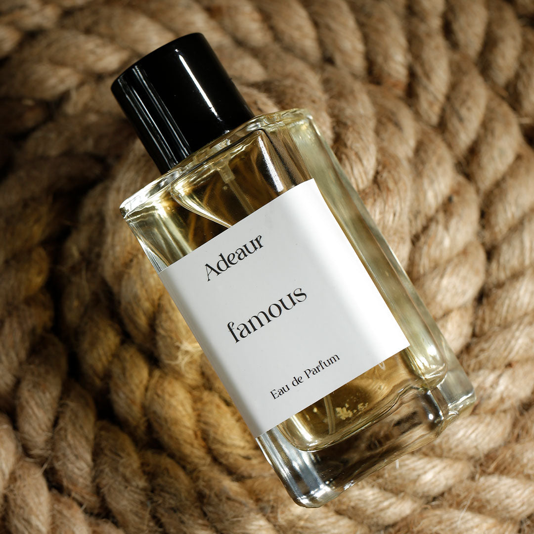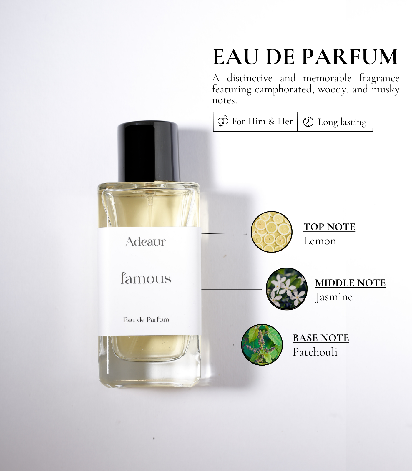 Famous is a distinctive and memorable fragrance featuring camphoraceous, woody, and musky notes. This unique scent is perfect for those who want to stand out. The camphoraceous top notes provide an intriguing freshness, while the woody and musky base adds depth and character.